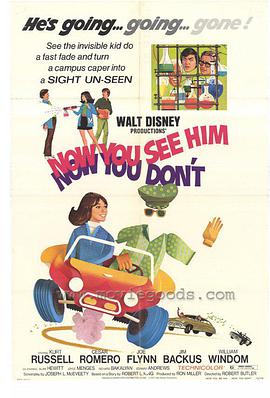Now You See Him, Now You Don't is a 1972 Walt Disney Productions film starring Kurt Russell as a chemistry student who accidentally discovers the secret to invisibility. It is the sequel to the 1969 film The Computer Wore Tennis Shoes and was followed by 1975's The Strongest Man in the World. Now You See Him, Now You Don't was the first Disney film to be shown on television in a two-hour time slot, in 1975.Previous television showings of Disney films had either shown them edited or split into two one-hour time slots. At Medfield College, science buff Dexter Riley and his friends, including Richard Schuyler and Debbie Dawson, eavesdrop via a hidden walkie-talkie on a board meeting led by Dean Eugene Higgins, discussing the small college's continuing precarious finances. Later that afternoon, Professor Lufkin shows Higgins around the science lab where Dexter is working on an experiment with invisibility and another student, Druffle, explores the flight of bumblebees. That night, during a powerful thunderstorm, the roof of the lab is struck by lightning, sending a current of electricity down a metal beam and through Dexter's complex experiment components. The next day, as Dexter examines his burnt equipment with dismay, Higgins meets with A.J. Arno, a recently released prisoner, who had also purchased Medfield's mortgage. When Dexter accidentally drops one half of his glasses into a container of his experimental formula, it appears as if the substance destroys them, but upon closer examination, Dexter realizes the frames are merely partially invisible. After several tests, Dexter places his fingers in the liquid and they disappear. Schuyler and Debbie arrive and are horrified to see Dexter with a partial hand, but Dexter insists Schuyler test the substance as well, admitting only afterward that he does not yet have an antidote. Just then, Higgins brings Arno to visit the lab, stunning the students, as only two years earlier, Dexter was instrumental in exposing Arno's crooked gambling scheme. Dexter and the others notice that Arno is more concerned with the campus architecture than Higgins' speech. Curious about Arno's behavior, Dexter convinces Schuyler to use the invisibility formula to sneak into Arno's office that night. Although they are nearly discovered when Schuyler steps into a puddle, making his tennis shoes visible, the boys get inside Arno's office where they find a model of Medfield College redesigned as a sprawling gambling establishment. After taking photos of the model, the boys flee with Debbie's help. The next day Dexter shows the photos to Lufkin and Higgins. Convinced that Druffle's bumblebee study would draw attention and investments to Medfield, Higgins reacts angrily when Dexter assures him that his invisibility formula could win the top prize money in the upcoming Forsythe science contest. Not having admitted to anyone that Medfield has been dropped from the contest for being too insignificant, Higgins contacts the contest's sponsor, millionaire Timothy Forsythe, and agrees to meet over a game of golf, despite his inability to play. Upon learning of Higgins' plan and suspecting it must be connected with raising money for the college, Dexter urges Schuyler to volunteer to serve as Higgins' caddy while, hidden by the invisibility formula, he will take control of Higgins' golf ball. At the golf club, Forsythe and the state university dean, Collingsgood, are amazed by Higgins' quirky golfing abilities, which include numerous hole-in-one-shots, as is Arno who is also at the club. After the game, Forsythe agrees to reinstate Medfield into the competition. Meanwhile, Arno accidentally sees Dexter becoming visible in the club showers and grows suspicious. When the local television news covers Higgins' extraordinary golf game, he is invited to join an exclusive tournament in nearby Ocean City. Convinced that he will win enough money to pay the college's mortgage, Higgins brashly accepts and that afternoon departs with Schuyler. Learning of the tournament from Druffle too late, Dexter misses the plane and is forced to watch the competition on television where Higgins' game against two professionals is a disaster. Arno and his henchmen, Cookie and Alfred, also watch the tournament and ponder Higgins' odd inconsistency. Upon returning to the college, Higgins tells Lufkin that Druffle's bumblebee experiment is the school's last chance. Both men are stunned when Druffle appears swathed in bandages after being attacked by the bumblebees, to which he is allergic. Hoping to assuage the crestfallen Higgins, Lufkin suggests that they give Dexter's unproven formula a chance and the dean reluctantly agrees. That evening, Cookie, disguised as a janitor, sneaks into the campus lab where he witnesses Dexter and Schuyler using the invisibility spray and reports to Arno, who orders him to return and steal it. The following day, Forsythe and members of his committee arrive on campus to judge the best science experiment at the college. Unaware that their spray bottle has been replaced by Cookie, Dexter and Schuyler make their presentation and are stunned when it has no effect. Forsythe and Higgins depart as Dexter remains confused until he chats with Charlie the janitor. Learning that there is no night janitor, Dexter realizes that Cookie likely stole the formula. Concluding that Arno must be behind the theft, Dexter plants a walkie-talkie in his office. A couple of days later, Schuyler overhears Arno plotting with Cookie to rob the Medfield Bank by making themselves and the money invisible. Certain that if he could retrieve the formula before the Forsythe Award announcement that night he could still win the contest, Dexter sends Schuyler to the police and goes to inform the bank's president, Wilfred Sampson. When both the police and Sampson dismiss the boys' story about invisibility, Dexter and his friends gather outside of the bank. When an invisible Arno and Cookie knock out the guards and ta