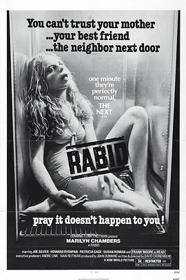 加拿大导演戴维.克罗南伯格执导的本片,主要描写骇人听闻的疯狗病,受传染的人会口吐绿液,双眼发光,并且见人乱咬,几个小时后即不治而亡。美国著名的“性”星玛里琳.查姆伯丝扮演的罗丝小姐幼时曾患过疯狗病,因车祸受伤引起病毒复发,腋下竟然不可思议地长出一个嘴巴,而且内有一个可伸缩自如的肉刺,专用来插到别人身上吸血。于是,她在一个接一个吸别人血的同时,也把疯狗病迅速传播,使城市瞬间成为疯人满布的人间地狱…… 影片评价 仅仅就身体变异而言,克隆伯格的独特之处在于处处不忘对色情幻想进行扭曲,无论是《狂犬病》(Rabid)中女主角必须由腋下长出一只阴茎来对其阴道作出支撑,还是《录像带谋杀案》(Videodrome)中男主角长出阴道般的裂口,都是这种扭曲的必然,连录像带的转子,都像双乳一样扭动。《录像带谋杀案》其实还有一个原来设想的结局,就是一男(男主角麦克斯)两女(尼基和卞卡)合体,同时以各自的变异性器官相互绞缠吞噬。在《赤裸的午餐》(Naked lunch)中,那个最终撕开男性外皮露出女体乳房的总裁如果还不够刺激,等你意识到她的装束是女同施虐的标准配备,就会有格外的颤栗。